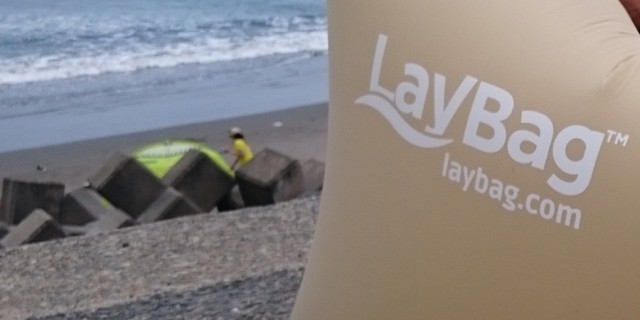 右上)木さえあればすぐにセッティングできるスラックライン。 左)電動エアポンプでSUPを膨らませて時間と体力を温存。そしてサイトから湖までは徒歩1分の好立地であった。