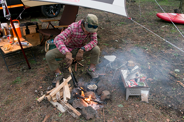 直火OKのフィールドなので焚き火がとにかく楽しい。薪を燃やして適度な炭にし、スキレット調理がしやすいよう、かまど用の溶岩の位置を整える。