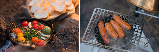 右)シェラカップに好みのスモークチップをひとつまみ入れ、小型の網を載せる。そこにソーセージを並べたらもうひとつのシェラカップでフタをする。ワンバーナーの弱火で熱し、好みのいぶされ具合で完成とする。