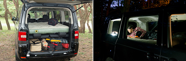 2、3列目シートをフラット状態にし、その上にエアベッドを設置。シート下部には収納スペースが多く、ソロキャンプの道具は余裕で積めるのだ。早朝の撤収も素早くこなせた。