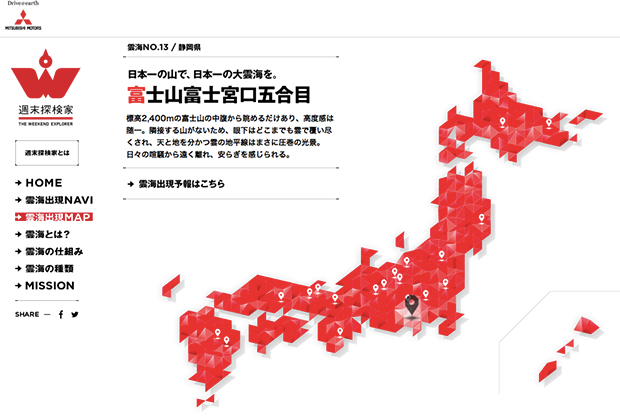 三菱自動車が気象情報会社・ウェザーニューズとタッグを組み、今春より打ち出したインターネットコンテンツが「週末探検家」。自然現象への挑戦を週末探険のテーマに設定し、週末のアウトドアライフをより豊かにするコツを続々展開予定だ。その皮切りとなるのが全国20カ所の雲海ポイントをまとめた「雲海出現NAVI」である。自宅から狙い目の雲海スポットを検索してみると、週末の雲海出現確率がわかる、かつてない趣向。もし週末、キャンプに出かける予定があるならば、キャンプ地近くの雲海スポットを検索してみよう。パーセンテージが高ければ迷わずGO! 普段なかなかお目にかかれない感動の絶景を眺められるかもしれない。