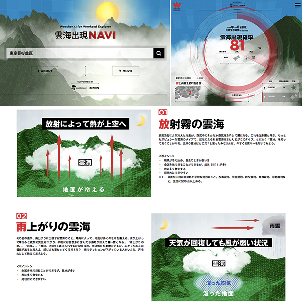 右上)来たる週末の雲海出現確率が表示される。この数値を参考にすることで雲海への遭遇率が高まるのだ。