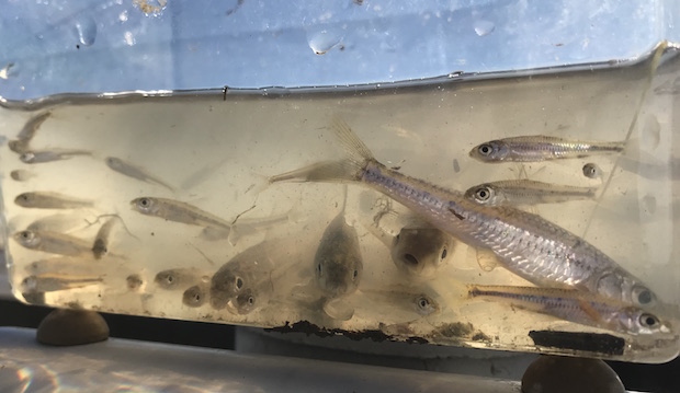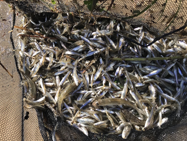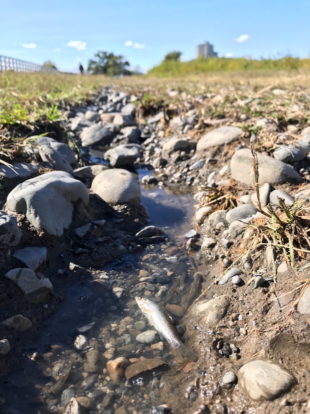 この日すくえたのはスゴモロコ、カマツカ、オイカワ、モツゴなどなど。きれいな川なら南蛮漬けで美味しく、水質に難のある川なら、飼育してもおもしろいでしょう。「干からびるに任せるのは忍びない」という人は本流に戻してあげてもいいでしょう(でも、水たまりに残った魚を楽しみにする野生動物がいることも忘れずに)。