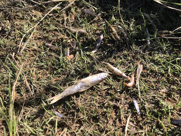 台風一過から半日、すでにちいさい水たまりでは魚たちは息も絶え絶えに。