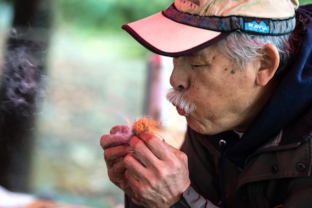 アウトドアの基本はナイフと火を使いこなすこと、という赤津さん。サバイバルキットを使い、あっという間に火を起こす。
