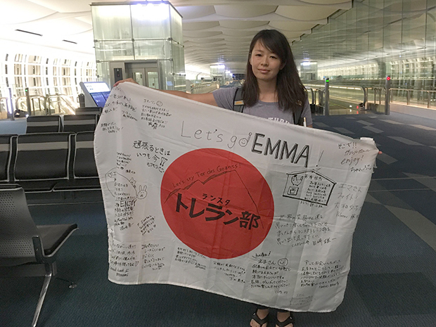 想定外のトラブルでローテンションのまま、仲間に出発の報告をしようと、寄せ書きでいっぱいの日の丸を持って、搭乗前に見ず知らずの人に写真を撮ってもらう。え? なに? あの人なんかの選手なの? 有名人なの? みたいなザワつきに気まずい顔しかできなかった。真夜中の薄暗い空港で、なんとも微妙な写真になってしまった。