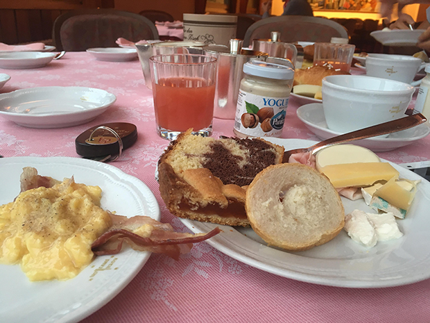 ホテルの朝食はなんでも美味しかった。チーズやハムは大好物だ。普段は米食が多いが、イタリアやフランスで食べるパンが美味しすぎて、帰国後もしばらくパン中毒になったほどだ。