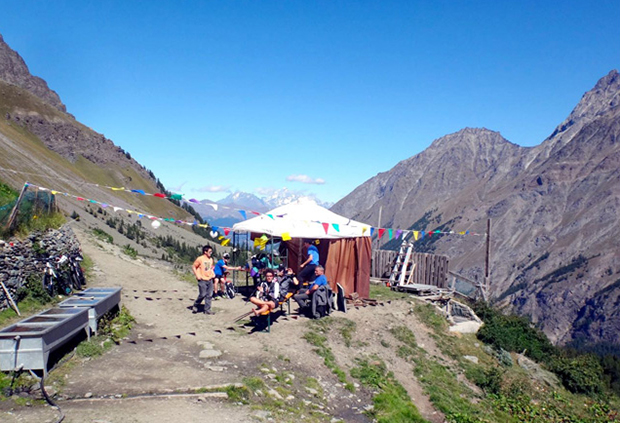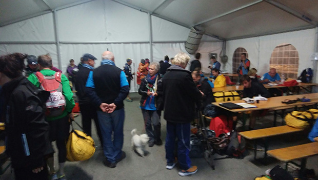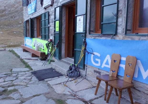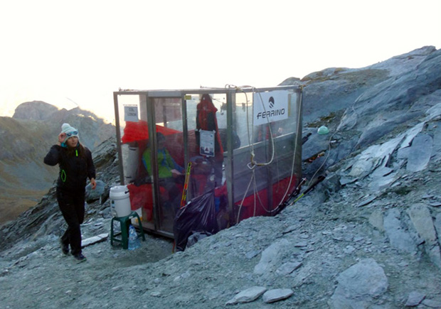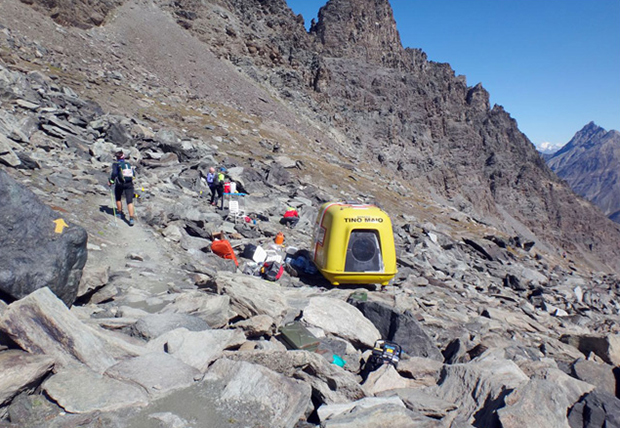 スタッフが待機する、臨時シェルター。山頂付近まで荷物を上げるのは容易なことではなく、シェルターごとヘリで降ろすらしい。ヨーロッパのレースではよく見かける。