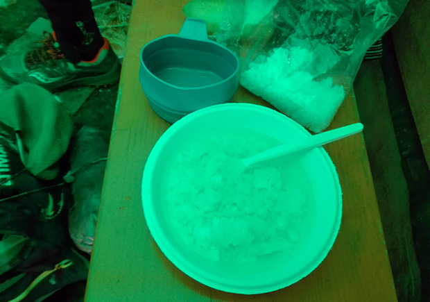 エイドのテントが緑だったので気持ち悪い色になっているが、エイドのスープにごはんを入れたもの。ライフベースごとに、日本から持ってきたアルファ米に水を入れてザックに忍ばせ、次のエイドには白米が出来上がっているという技。それを少しずつスープなどに入れて食べた。やっぱりにぎりめしのパワーは絶大だ。