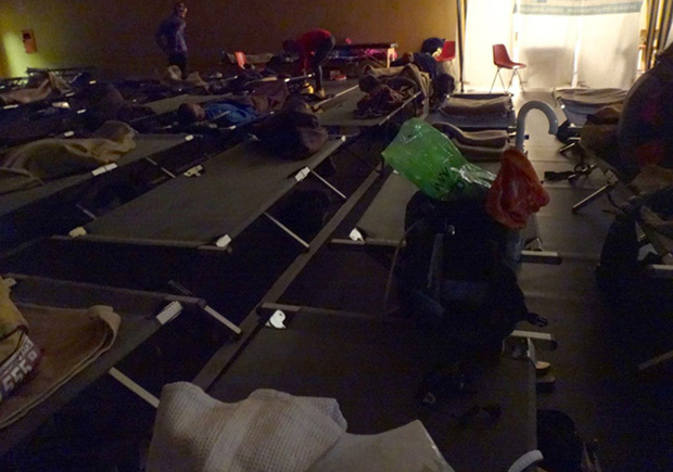 毛布一枚では寒いという人もいるが、持ってきている防寒着を着込めば平気だった。