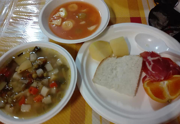 スープを頼むと野菜たっぷりの薄いスープに小さな粒のパスタが入っていた。それにパンを浸し、大好きなプロシュートとチーズも食べた。フルーツカクテルをデザートにしたら、これがものすごく美味しくておかわりまでした。満腹だ。茹でたじゃがいもは、次の行動食としてジップロックに10カケラくらい詰め込んだ。人間は不思議なもんだ、食によって生きる力がうんと湧いてくる。