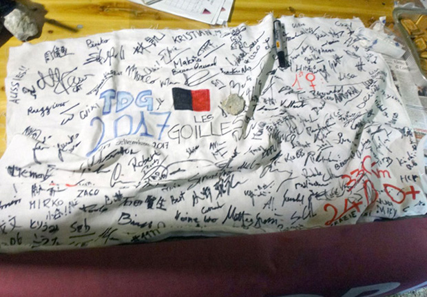 レース中、ポスターにサインを書くのがトルデジアン流らしいが、ここは布だった。日本人の名前をたくさん見つけると、だいたい自分が皆からどのくらい遅れているのかがわかる。
