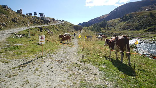 ビニールテープが張ってあるが、通ってはダメ、ではなく、ここを通れということらしい。めっちゃ牛いますけど?