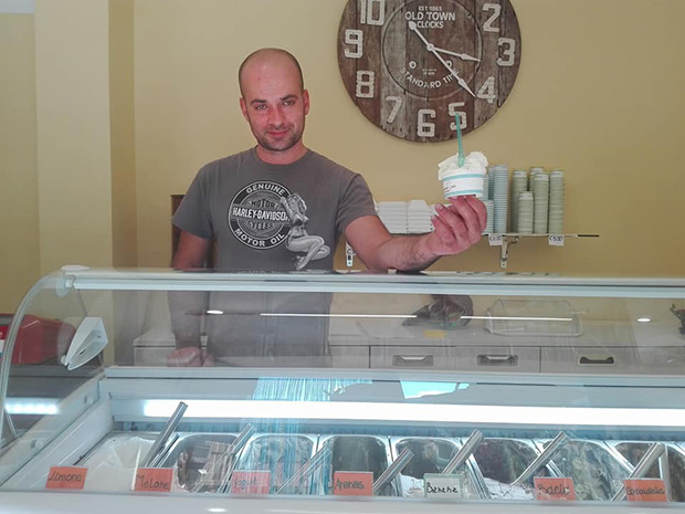 今回のレースでこの時が一番暑かった。薄いメッシュのTシャツ1枚でも汗をかいて身体が燃えていた。そんな時に道路の向こうにジェラート屋さんを見つけた。