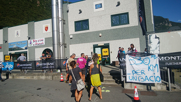 人間。なかなか学ばない。結局、ジェラートでベタベタになって不快極まりない手のやり場に困りつつ、応援のハイタッチもできず、トルデジアンの名所とも言える石造りの門をくぐる時もろくに写真すら撮れず、実に微妙な状態で、3つ目のライフベースDONNAS(151.3km)に着いた。