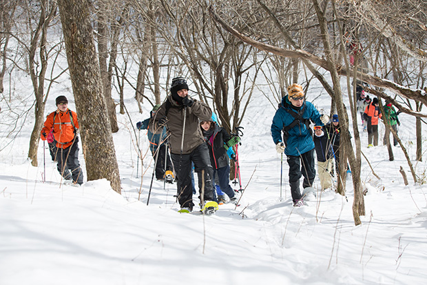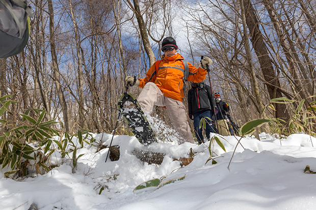 トレイルは総じて静かな林間で、急登はわずか1カ所。ゆっくりゆっくり進むため、日ごろ運動不足な人でも安心して歩けるルートだ。参加者はスノーシューが初めての人も多く、雪上を歩く新感覚に大満足の様子。1時間ほどのんびり歩いていると、かすかに水の音が聞こえてきた。