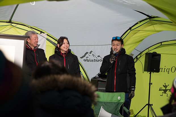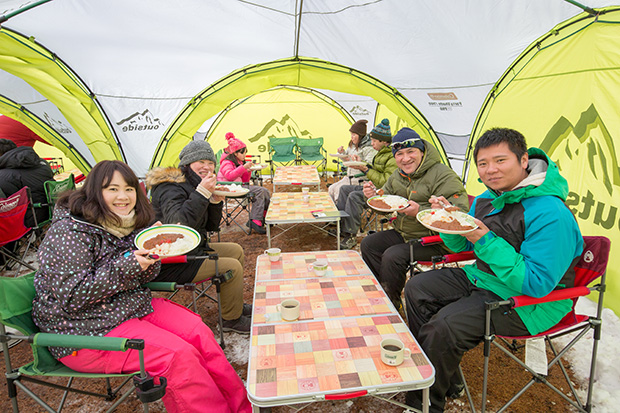 1日目、まずはアクティビティから始まる。ツアーのベースとなるキャンプ場outsideBASEのオーナーでもある快適生活研究家・田中ケンさんがガイドをするスノーシューツアーである。スノーシューの装着法、歩き方のコツなどのレクチャーを受けたらキャンプ場から林間へ歩を進め、いざ北軽井沢の名瀑・浅間大滝をめざす。
