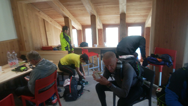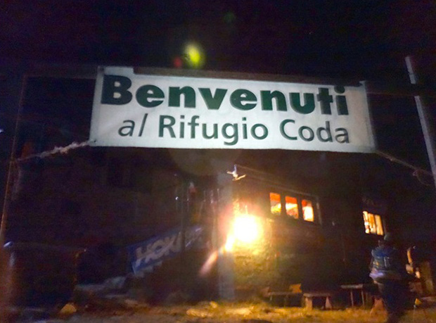 次にめざすは、有名な小屋、Rifuge Coda(コーダ小屋)。コーダまでの上りは、今回のレースで辛かった場所の5本の指に入るかもしれない。途中の小屋でベッドで寝ることを望んだが、1時間待ちだった。しかも待ち時間を外で過ごせという。とんでもない、外は氷点下だ。立ち止まると身体がガタガタ震える。レストランの隅っこのテーブルの下に潜り込み、身体を丸めて5分だけ目を閉じて、再びCodaをめざした。軽快に下りてくるハイカーに「あとどのくらい?」と聞くと「40分だね!」と言われて40分経ってもただの登りだった。ピョンピョン下りて行くハイカーの脚の長さはわたしの3倍あったのかもしれない。