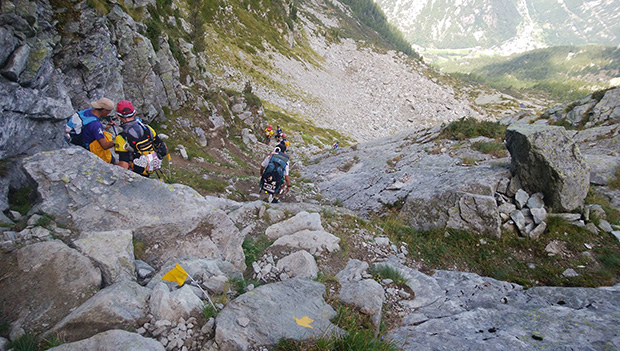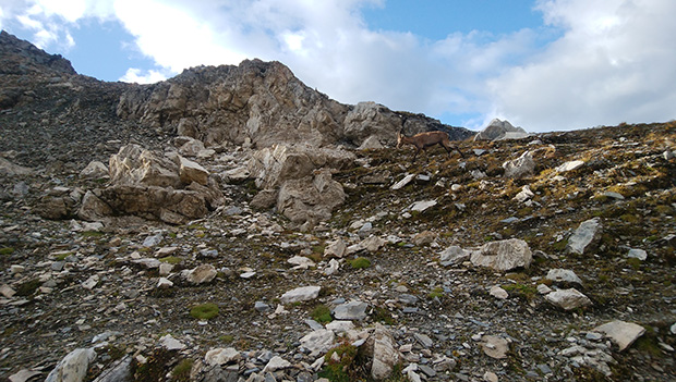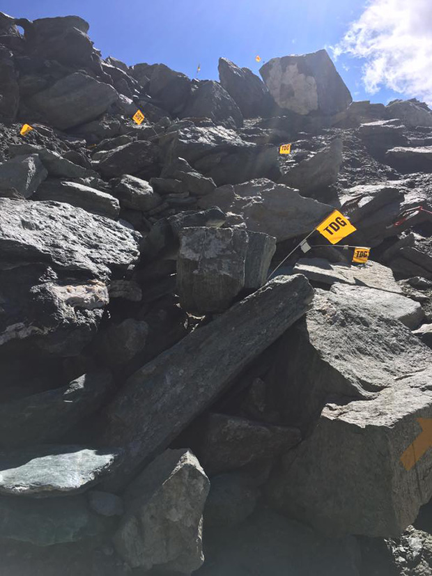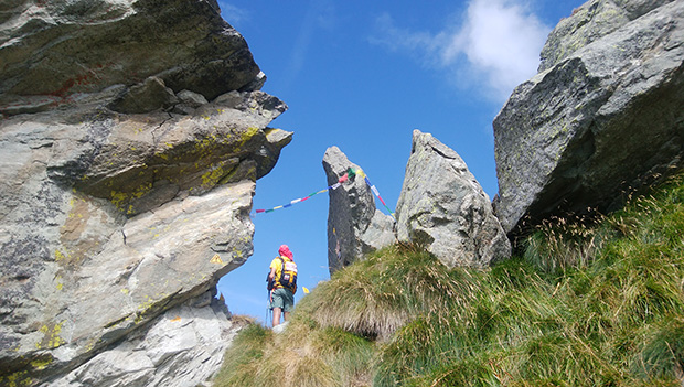 やっと目が覚めたのは、それから数時間後。びっくりするような角度の岩の登りが眠気を吹き飛ばした。日本には「浮石」なんていう言葉があるが、馬鹿でかい浮石でできたジェンガのようだった。こんなの、日本なら確実に破線ルートじゃないか。躓きでもしたら一瞬で谷間へ真っ逆さまな根性試しの急登と足幅ほどのトラバースの先に、コルはあった。