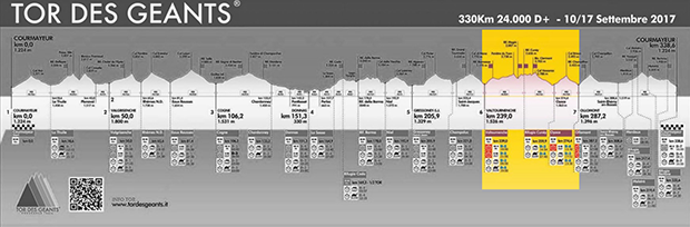330km、制限時間6日と6時間。難関のトレイルランニングレース、Tor des Geants(トルデジアン―巨人達の旅)。心身共にかなりの疲れが見え始めてきた4日目。ついに遅れを取りはじめ、関門がすぐそこまで迫ってきた。コース上で救助される選手、関門に間に合わず泣き崩れる選手。そんな光景を前にどんどん心がすさんでいく。周りの選手の数も少なくなっていくなかで、冷静さを欠いて、暴走しては潰れ、暴走しては潰れを繰り返す。応援に来ていた友人からや大会スタッフのサラに励まされながらなんとか5日目を乗り切った。約240km。・・・・・・あと2日。