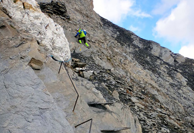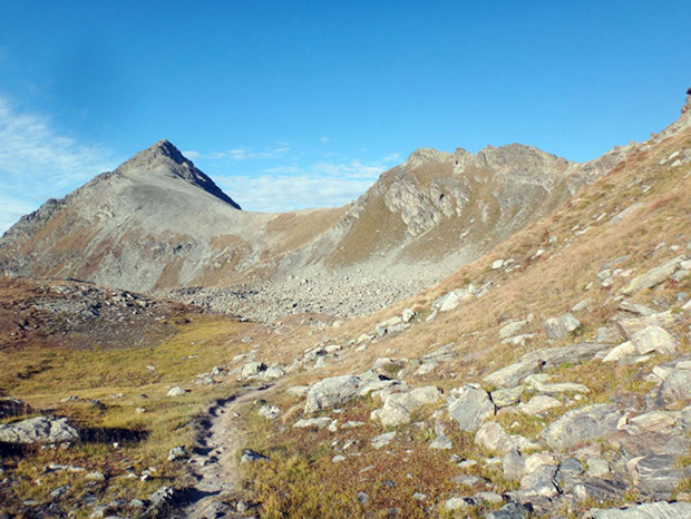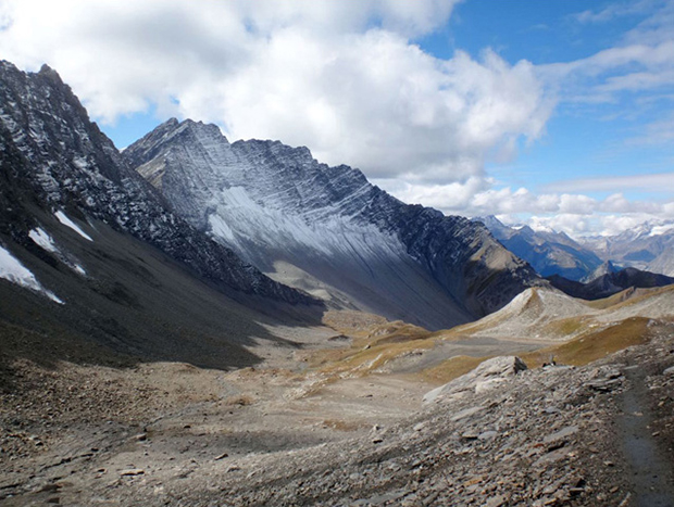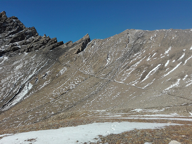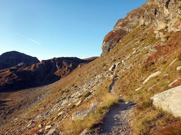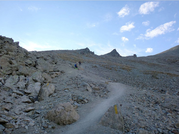 7日目、最終日の朝。最後の小屋の次にそびえるCol Malatraへの道は人生でも指折りの感動的な場所だった。マラトラは、トルデジアンでもっとも象徴的な峠だ。いつか、行ってみたい場所だった。マラトラへ峠の最高地点へ導く、岩盤のような斜面をまっすぐに横切るトレイルのラインは、自分が信じてきたもの、貫いてきたもの、そういうものを表しているようだった。