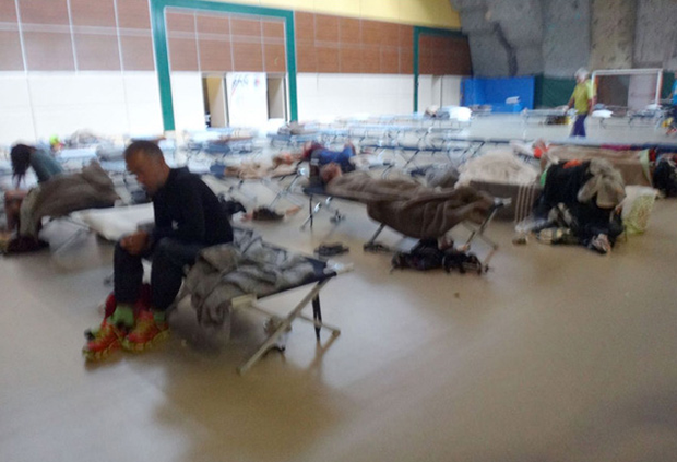 あれ? 何か冷たいものが顔に当たったかな? と思ったら、たちまち細かい雹(ヒョウ)のが一気に吹き付けてきて、あっという間に視界が真っ白になった。目が開かないほどの細かくて強い吹雪。慌てて走って近くの小屋に入ったものの、狭いスペースに選手達がすし詰め状態で居場所がなく、足早に小屋を後にした。吹雪に晒されながらしばらく進んだ先の避難小屋のような場所に駆け込んだ。ガタガタ震えながら、天候が落ち着くのを待っていた。雪が弱くなり始めた頃に、ヨシダさんが追いついてきた。