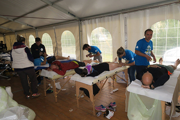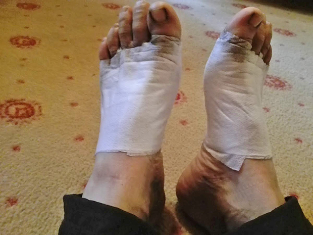 ベッドに横になる前に、靴を脱いで、靴下も脱いだ。一週間、ろくにお風呂も入らず、シューズを履きっぱなしで走り続けると、足の裏がとんでもないことになる。人間の足は一週間で330km走るようにはできていない。足の裏で全身を受け止めているわけで、足裏のトラブル回避は完走する上でとても重要だ。足の皮がふやけないように、エイドステーションや小屋に寄る度にシューズも靴下も脱いで足を乾かした。靴紐は全部ゆるめて、履く時に一番下の穴から全部再び締め直して、丁寧に結ぶようにした。脚の擦れや皺をふせぐジェルを何度も何度も塗り直して保護をした。それに加え、4つ目のライフベースのメディカルスタッフが施してくれた不思議なシートがクッションになり、今のところマメも水膨れもなかった。
