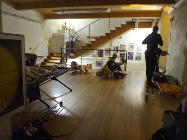 美術館のような内装の教会。部屋ではなく、廊下や踊り場ににベッドが並べられている。
