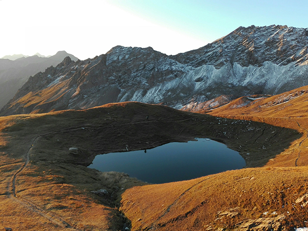 幾重にも重なる波のようなトレイルを越えて、穏やかな丘の先に、朝陽に照らされる大きな小屋が、湖の向こう岸に見えた。それは、黄金に輝いてみえた。