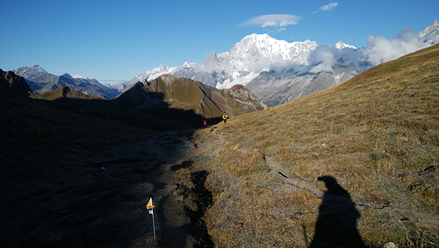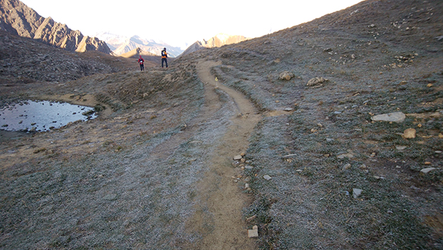どこまでもいい人だ。でもわたしも、そんな風にしてここまで引っ張ってもらっていた。ひとり小屋を出て15分ほどの急登をコルまで登り切って振り返ると、中腹にヨシダさんともう1人が見えた。寒すぎて止まっていられない。仕方なく、ゆっくりと下る。下りはまだ走れるわたしはどんどん下りるけれど、ヨシダさんと青い瞳の“おじいさん”は一向に近づいて来ない。