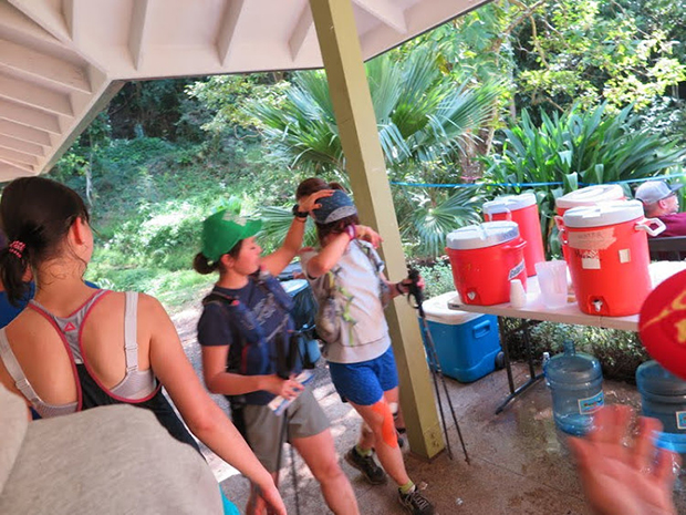 「今、8時で、あなたたちはまだ4周目。5周目のcut off timeはNature Centerの11時半。後3時間半でParadise ParkからNature Centerまで戻らないとダメだけど、今の状況で3時間半で戻るのはちょっと無理だと思う。もちろんこのまま続けてもいいし、ここでやめて、わたしたちと一緒にベーコンクスランブルの朝食を食べていってもいいし、どっちにする?」