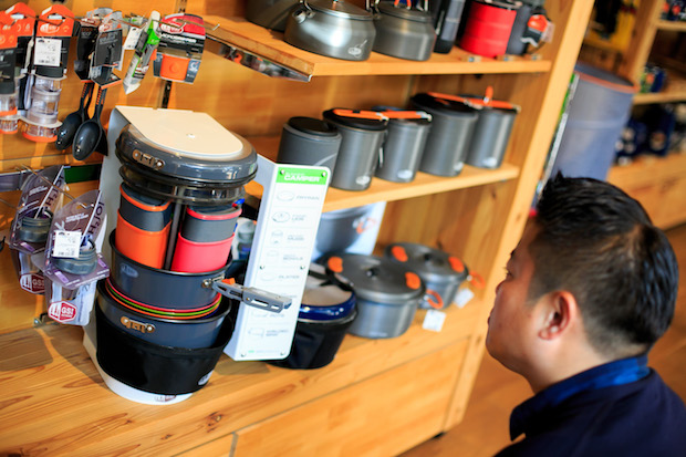 つぎに向かったのは、料理家ならば気になる調理器具のコーナー。心平さんは、GSIのバガブーキャンパーを手にとり、そのスタッキングのおもしろさに目を見張っています。