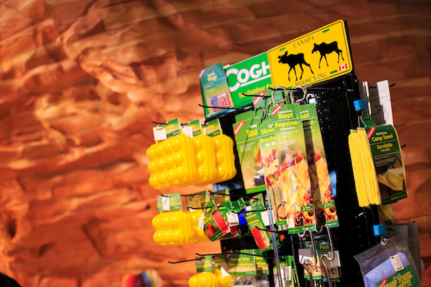 と、だいぶいろいろと欲しいものを吟味してきた心平さんが足を止めたのが、コフランの什器の前。コフランは、カナダのアウトドアブランドで、キャンプなどで役に立つ楽しい小物がたくさんあるブランドで、エイアンドエフが入れている商品だけでも90点以上にもなるといいます。そのなかで、心平さんが手に取ったのは、くねくねと曲がったステンレスの支柱のような商品です。