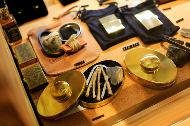 「これはA&Fオリジナル商品で、火打石セットです。1655年に設立された北米最古のタバコ企業、ハドソンベイカンパニーで販売していた真鍮製のタバコケースの中に、フリントと呼ばれる石と、火打金、そして、火花を着火させるチャークロスと麻紐が入っています。フタにはレンズもついていて、これで太陽の光を集めて火を作ることができるんです。これがあればライターはいりません。自分で作った火というのは、とてもありがたく、火がとても神聖なものであると感じることができます」