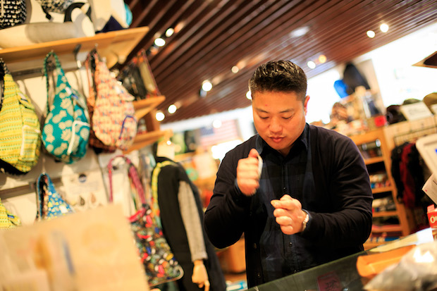 店長の平戸隆志さんの詳しい説明にうなずきながら、フムフムと道具を手にとり、実際に組み立ててみる心平さん。