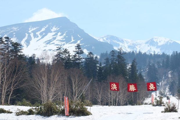 前日の夜は雪がちらついた十勝岳温泉付近。翌日は快晴で気温もあがり、朝からから雪もザラメ状態に。写真はアドベンチャレースのスタート地点、横断幕が渋すぎです。