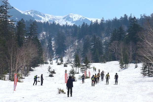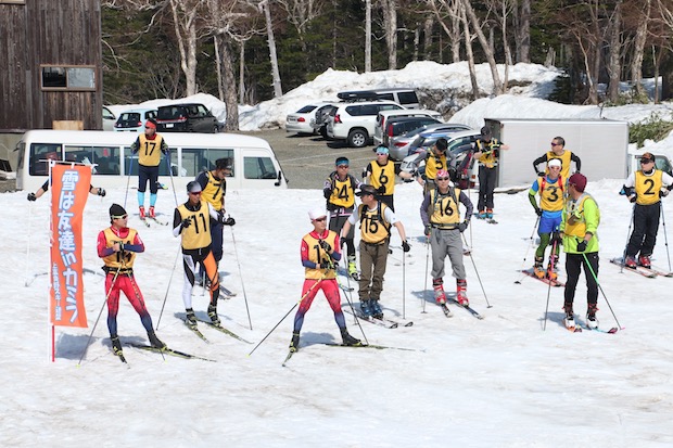 「え、めっちゃおもしろそうじゃないですか、出ます!」と、即参加表明を出しました。当日、スタート地点にはクロカンスキーヤー、テレマーカー、山スキーヤーと、さまざまなジャンルの人々が集まりました(ぼくは一般的な山スキー道具で参戦)。開会式の挨拶でも、登りにアドバンテージのあるクロカンが逃げ切るか、それとも下りでスキーヤーがクロカンを刺すのか……なんて話題がある、加えて救護体制も本格的で、救護班のリーダーのかたが「行く手を阻む人がいたら倒してもらってかまわない、もしケガをしたら私がピステンで助けに行きます!」という台詞を聞いて、あ、これはある種、雪山の異種格闘技的なガチンコ徒競走なんだ……と、今更ながらに分かったわけでした。