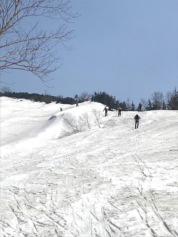 コースは三段山の入り口でもある白銀荘の駐車場前をスタートして、8つあるチェックポイントを通過し、ふたたび白銀荘前に戻ってくるというもの。事前に標高差や距離のアナウンスはないものの、手持ちのGPSウォッチで計測したところ、距離が3kmちょっとで、標高差は300mといったところ。この数値だけを見たら、たいして辛くないのではと思うかもしれませんが、選手の方々はかなりの本気モードでついて行くのに必死。けっこうペース早くないですか?……と思って腕時計を見ると、ふだん、自分がBCでハイクアップするの倍以上のペース。それに加えて当日は気温も高くて、登りはじめて200mくらいで、額から汗がしたたり落ち始める。“あれ、このままだと脱水になりそうでマズいな”と思いながらも、先を行くスキーヤーに遅れたくない一心で、ひたすら登る。
