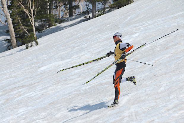 一位の選手を追い、クロカンスキーを脱いで斜面をダッシュで駆け下りる、まさに韋駄天スタイル。アドベンチャーレースの真骨頂だ。
