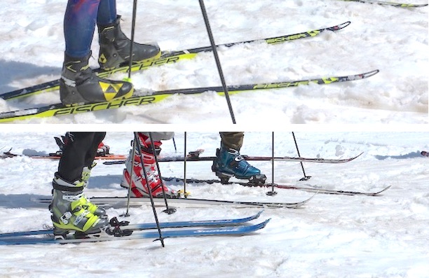 クロスカントリースキーで参加する選手の足元と、山スキーの選手の足元。この日は気温も上昇したのでTシャツ&短パンで参加する人も。