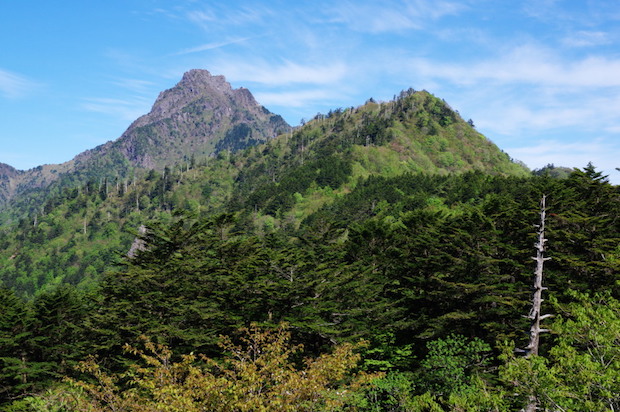 石鎚山(左の岩山)への登山口・土小屋には無料駐車場、トイレ、白石ロッジ、国民宿舎石鎚がある。