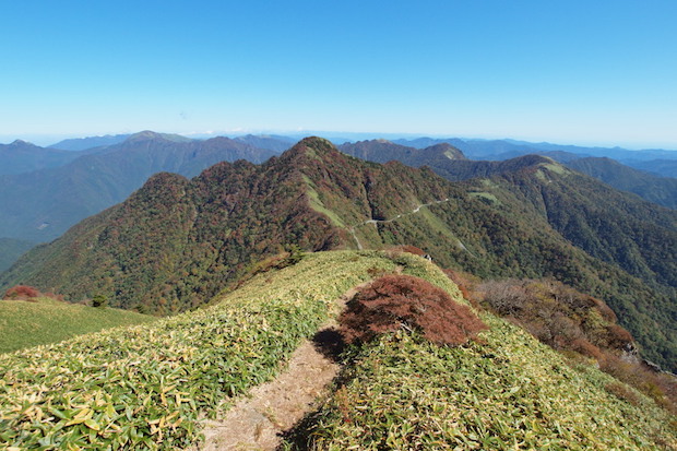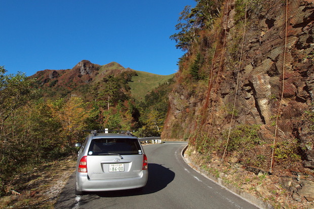 あの道があるのは四国の山奥、標高はなんと1,100~1,700m。石鎚山(1,982m:西日本最高峰で日本百名山)へと連なる峰々を縫っていく、約27㎞にわたる天空の道路であります。