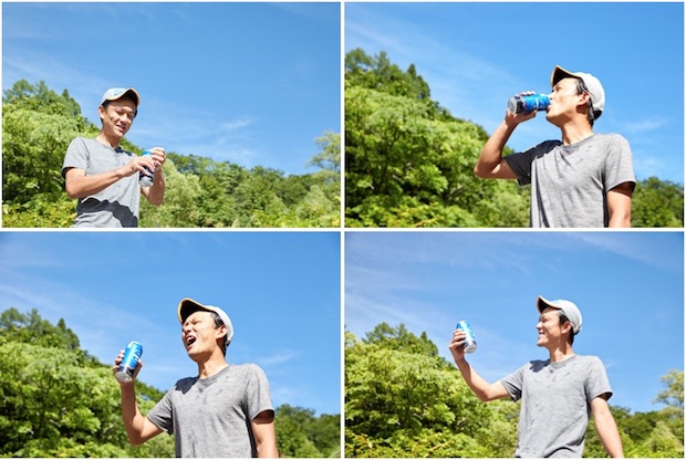 右上:プシュッとする瞬間、ついにやけてしまう。頼むからあと30秒、世界よ平穏であれ。右上:ゴクゴク、ゴクゴク、ゴクゴク。静かに。誰も話しかけないで。左下:ぷはっーー、うまーーっ! 右下:くーーっ。もっと安ければ毎日飲みたいぜ。