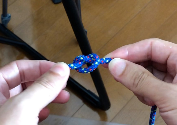 キャンプで使うロープワークくらいなら大丈夫だろうと、固結びしか使わないロープワーク動画を撮影してみた。使う結び方はこの固結びだけ。