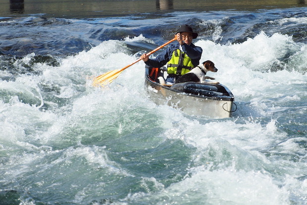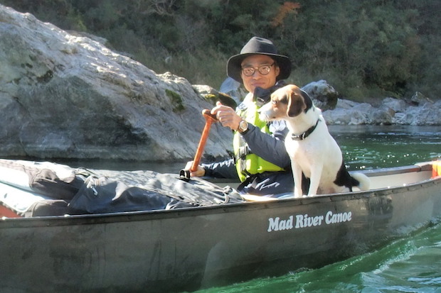 上田さんはカナディアンカヌーにボルダリングマットを2枚積んでいる。瀬で波をかぶると濡れるのが玉にきず。