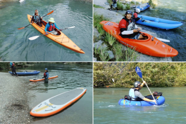 左上から時計回りに、レクリエーショナルカヤック、ホワイトウォーターカヤック(手前)とダッキー(奥)、パックラフト、SUP(インフレータブル式)