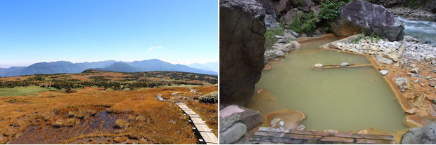 (左)池塘と木道が広がる、苗場山山頂。(右)天然の露天風呂が楽しめる赤湯温泉。