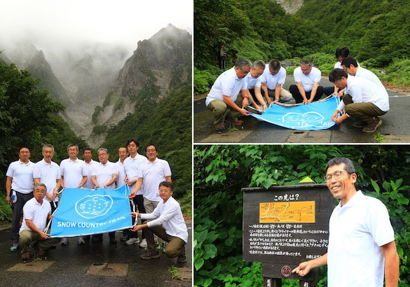 (左・右上)開通式はテープカットではなく、登山で使うスリングとカラビナを7市町村で繋ぐ「リングベントセレモニー」を行ない、雪国観光圏で一つの大きな輪をつくった。(右下)SCTコース道標を設置するアドベンチャーレーサーの田中正人さん。公式サイトでダウンロードできる地図に道標の位置と管理番号が記載されており、同じ地点に同じ管理番号の道標が設置されている。