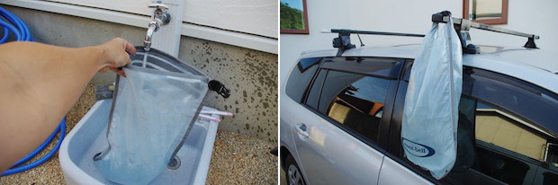防水バックは10~20ℓの容量があるので、パンクした自転車タイヤチューブの修理みたいに「空気を入れて水に沈める」というのはちょっと大変です。なので、ここは発想の逆転。水に沈めるのではなく、水を入れたらどうだろう?