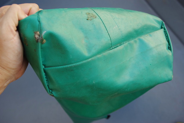 この防水バックは30年以上使っていて、「この傷が浸水の原因か?」という箇所を修繕してあります。しかし、修繕個所からも「穴かも?」という傷からも水漏れは無し。なかなか優秀な素材ですが、バックの底の接合部から水漏れがありました。